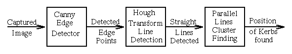 Typically, in Europe and the USA, a kerb is accompanied by a number of parallel lines close together. Weak perspective projection is a good approximation to perspective projection in this case as the variation in depth of the scene is small compared to the depth along the line of sight. As a result, parallel lines in the world project to parallel lines in the image, so we can use the Hough Transform [ 12 ] to detect clusters of parallel lines in the image as evidence for a kerb. As we do not need disparity information, we just consider a single image. The flow diagram is as shown in Figure 1 .
