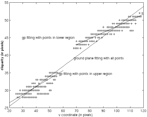 Figure 8 shows the step-down from another angle, Figure 9 shows the graph for the matched edge points together with the fitted ground plane using all points and the fitted ground planes using just points in the lower or upper region. This is a typical two-population problem and it can be seen that ground-plane fitting the points in each individual region will help in more accurate small obstacle detection.
